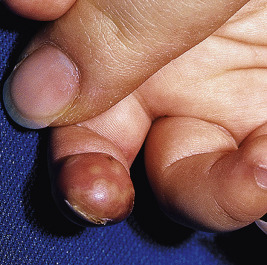 Herpetic whitlow is a unique form of HSV infection involving the pulp of the distal phalanx (or multiple phalanges). It is seen most often in physicians, dentists, dental hygienists, and nurses who have contact with the mouth or genital regions of patients with herpetic lesions. It may also occur as a result of autoinoculation in patients with herpes labialis, herpes stomatitis, or genital herpes. The virus is inoculated onto the skin of one or more fingers, resulting in a deep-seated, painful vesicular or bullous eruption with erythema ( Fig. 15-10 ). Spontaneous resolution usually occurs over 3 weeks if the condition is left untreated. The differential diagnosis of herpetic whitlow may include blistering dactylitis, burns, and impetigo. The diagnosis is confirmed by viral culture or direct fluorescent antibody testing, and treatment with oral acyclovir or other antiviral agents may result in alleviation of pain and more rapid healing.