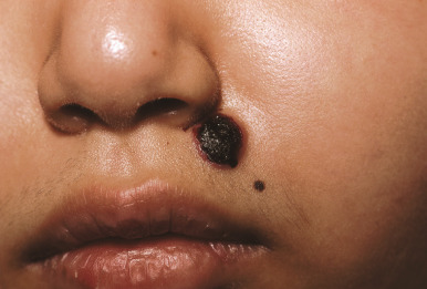 Herpes in the immunocompromised host. This large, crusted plaque was culture-positive for Herpes simplex in this 6-year-old female receiving chemotherapy for leukemia.