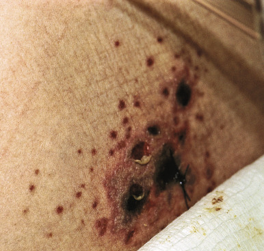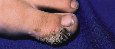 Severe, chronic, and recalcitrant HSV infections may be seen in the setting of immunodeficiency. These settings include individuals with hematologic malignancy, those with a history of bone marrow or solid-organ transplantation, and those with HIV infection. Although these patients may develop common forms of HSV infection, their lesions may be more widespread and extensive. Persistent or recurrent ulcers are a common manifestation of HSV infection in patients with AIDS. Large, persistent ulcers in patients infected with HIV should arouse suspicion for HSV, although the differential diagnosis may include syphilis and chancroid. Less common locations such as the buttocks and back are also more likely to be involved in these patients. HSV lesions in immunocompromised hosts may also be verrucous, pustular, markedly crusted ( Fig. 15-11 ), necrotic ( Fig. 15-12 ), or exophytic.
