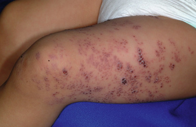 Herpes zoster. Confluent vesicles and crusted vesicles with erythema in a dermatomal distribution on the left thigh. This boy was otherwise healthy with no identifiable underlying predisposition.