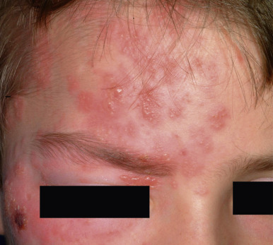 Eczema herpeticum (EH, or Kaposi varicelliform eruption; see Chapter 3 ) is a severe, disseminated HSV infection that occurs in individuals with atopic dermatitis or other chronic skin disease, including pemphigus, Darier disease, burns, and others. Although the etiology of EH has not been clearly established, the impaired skin barrier associated with these diseases is believed to create a more permissive environment for viral invasion and binding to cellular receptors, leading to a higher prevalence of EH with greater dermatitis severity. Despite the high prevalence of atopic dermatitis in the general population and frequent exposure to HSV, EH is quite rare, possibly relating to a requirement for multiple additional host and environmental factors. Single nucleotide polymorphisms in the interferon regulatory factor 2 ( IRF2 ) gene have been demonstrated to confer a greater risk of EH, possibly reflecting an abnormal immune response to HSV. Patients with EH usually experience an abrupt onset of fever, malaise, and a widespread eruption of monomorphous vesicles and erosions ( Figs. 15-8 and 15-9 ; see Chapter 3 , Figs. 3-28 and 3-29 ). The lesions are most prominent in areas of active dermatitis but especially tend to involve the head, neck, and trunk.