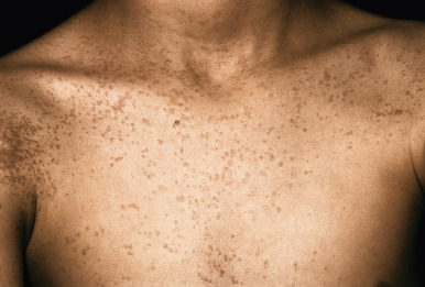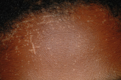 Verrucae plana (flat warts) occur primarily on the face, neck, arms, and legs. They are usually seen as smooth, flesh-colored to slightly pink or brown, flat-topped papules measuring 2 to 5 mm in diameter (see Fig. 15-16 ; Figs. 15-27 and 15-28 ). They vary from a few lesions to several hundred in any given individual. They may appear in the bearded areas of men and on the legs of women, because irritation from shaving tends to cause their spread. Contiguous warts may coalesce to form larger, plaque-like lesions. Again, linear arrangements of the papules in areas of scratching (koebnerization) are characteristic (see Fig. 15-16 ; Fig. 15-29 ).