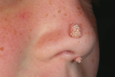 Common warts. A dome-shaped lesion of the lateral nose and a filiform lesion of the columella.