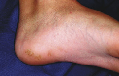 Black heel (talon noir, calcaneal petechiae) is a common condition that is often confused with plantar warts. In this disorder, superficial dermal capillaries are ruptured by the shearing action associated with sudden stops in athletic individuals, usually tennis, racquetball, or basketball players. Clinically it is characterized by clusters of brown or blue-black pinpoint petechial macules in the horny layer along the backs or sides of the heels or lateral edges of the feet. Gentle paring of the surface with a number 15 scalpel blade can help differentiate this condition from malignant melanoma, calluses, corns, and plantar warts.