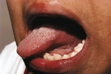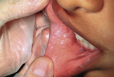Herpetic gingivostomatitis most commonly occurs in children between the ages of 10 months and 5 years, although it may occur at any age. It presents with small vesicles on an erythematous base that evolve into painful, shallow gray erosions and ulcerations ( Fig. 15-1 ). The lesions most often involve the palate, tongue, and gingivae. Gingival swelling and easy bleeding may occur. Perioral lesions involving the lips, cheeks, and chin ( Fig. 15-2 ) occur in up to three-quarters of patients. Other common features include fever, drooling, eating and drinking difficulties, foul breath odor, and irritability. Cervical and submandibular lymphadenopathy is also quite common. Secondary bacteremia with group A β-hemolytic streptococci, Staphylococcus aureus, or other organisms may occasionally be a complication. Associated hepatitis has been observed, most often in neonates and immunosuppressed patients with acute primary HSV-1 infection, but also rarely in immunocompetent children.