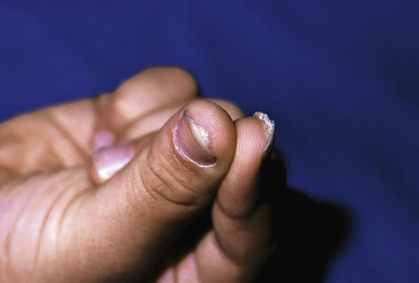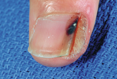 Periungual warts. Verrucous papules of the lateral nailfold. Note adjacent subungual hemorrhage.