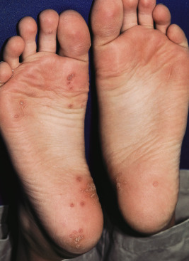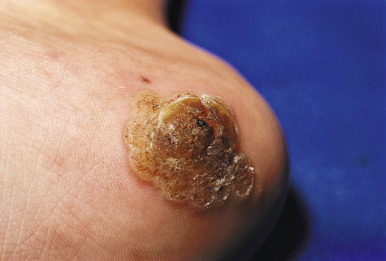 Verrucae plantaris (plantar warts) occur on the plantar surfaces of the feet and tend to be the most symptomatic type of warts as well as a therapeutic challenge. They usually occur on the weight-bearing areas of the heels, toes, and midmetatarsal areas ( Fig. 15-30 ). Because of the pressure of walking, the lesions often develop an endophytic component and are very painful and tender. Coalescence of multiple lesions may result in mosaic warts ( Fig. 15-31 ). It may occasionally be difficult to differentiate plantar warts from corns or calluses. Corns are localized hyperkeratoses that form over interphalangeal joints as the result of intermittent pressure and friction. Penetrating corns often appear at the base of the second or third metatarsal–phalangeal joint. They can be distinguished from plantar warts by the lack of thrombosed capillaries after paring and by their characteristic hard core. Soft corns are macerated hyperkeratotic lesions that persist at points of friction and pressure in intertriginous areas. They are usually seen on the lateral aspect of the toes or in the web spaces between the fourth and fifth toes.