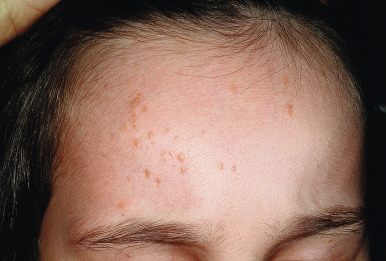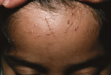 Warts with koebnerization. Multiple small, verrucous papules with a linear clustering (Koebner phenomenon) were present on this child’s forehead.