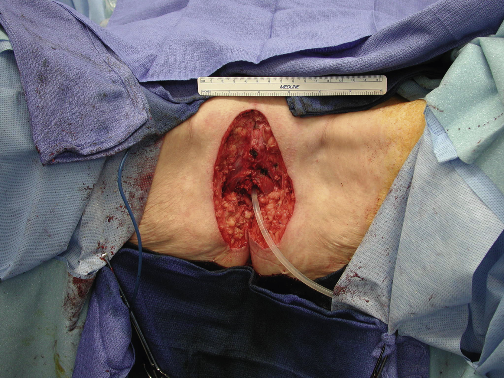 Preoperative view showing a large soft tissue defect, measuring 15 × 8 cm, in the midline vulva down to the deep muscles and tissues after a wide local excision for squamous cell cancer.