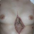 Under general anesthesia, the patient was placed in the lithotomy position and the vulva soft tissue defect was assessed. A Folly catheter was placed prior to surgical excision. The superior and inferior areas of the defect could be closed after simple skin undermining. Bilateral skin V-to-Y advancement flaps were designed and the skin marking was extended to the proximal thigh. The extent of the flap dissection was outlined for each side ( Fig. 36.2 ).