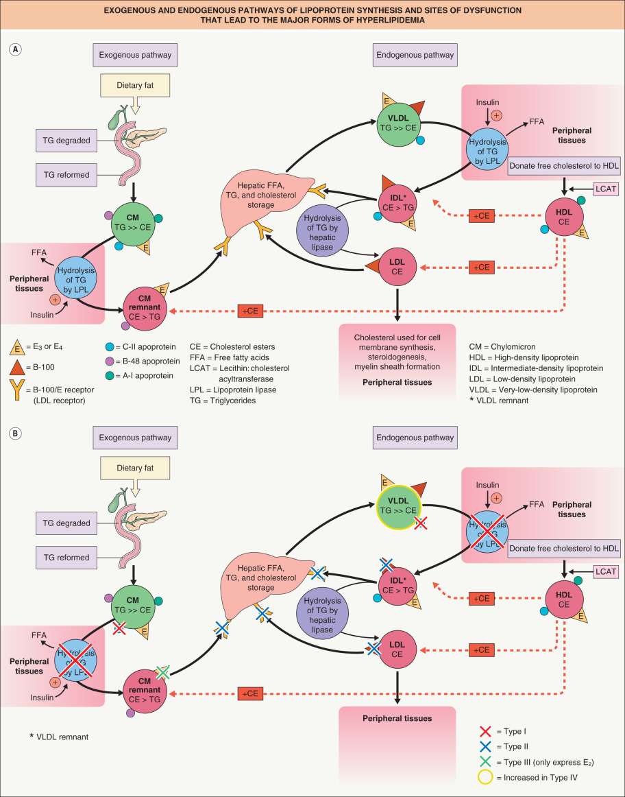 Due to the complexity of cholesterol homeostasis, there are several possible ways in which hyperlipidemia may occur, from inherited disorders to metabolic diseases such as diabetes mellitus. Genetic mutations can affect important enzymes, receptors or receptor ligands, with such defects leading to the overproduction of lipoproteins or the inhibition of their clearance ( Fig. 92.1B ). Each possible defect would lead to a different abnormal lipid profile.