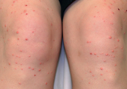 Eruptive xanthomas appear as erythematous to yellow papules, approximately 1 to 5 mm in diameter ( Figs 92.2 & 92.3 ). They are usually distributed on the extensor surfaces of the extremities, buttocks, and hands. Early in their development, lesions may have an inflammatory halo (likely due to their triglyceride component), which may be accompanied by tenderness and pruritus. The Koebner phenomenon has been reported to occur with eruptive xanthomas .