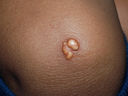 Tuberoeruptive and tuberous xanthomas are clinically and pathologically related and often described as being on a continuum. Tuberoeruptive xanthomas present as pink–yellow papules or nodules on extensor surfaces, especially the elbows and knees ( Fig. 92.5 ). Tuberous lesions are noted to be larger than tuberoeruptive lesions and may exceed 3 cm in diameter ( Fig. 92.6 ). Together, these lesions can be seen in hypercholesterolemic states such as dysbetalipoproteinemia (Frederickson type III) and familial hypercholesterolemia (Frederickson type II; see below). In contrast to eruptive xanthomas, tuberous xanthomas are usually slow to regress following institution of appropriate therapy.